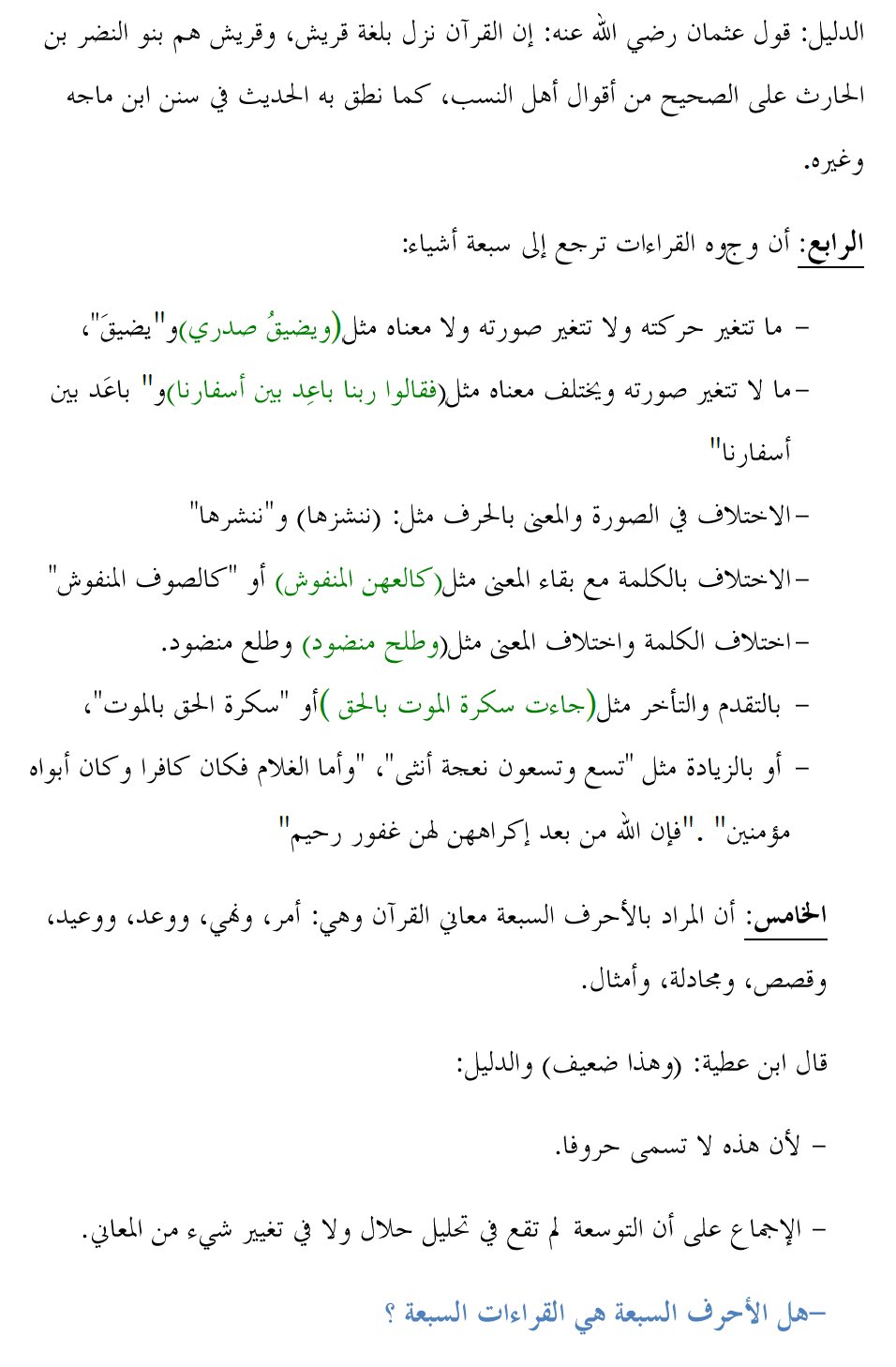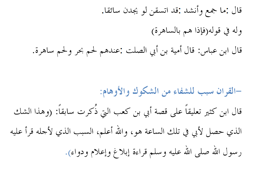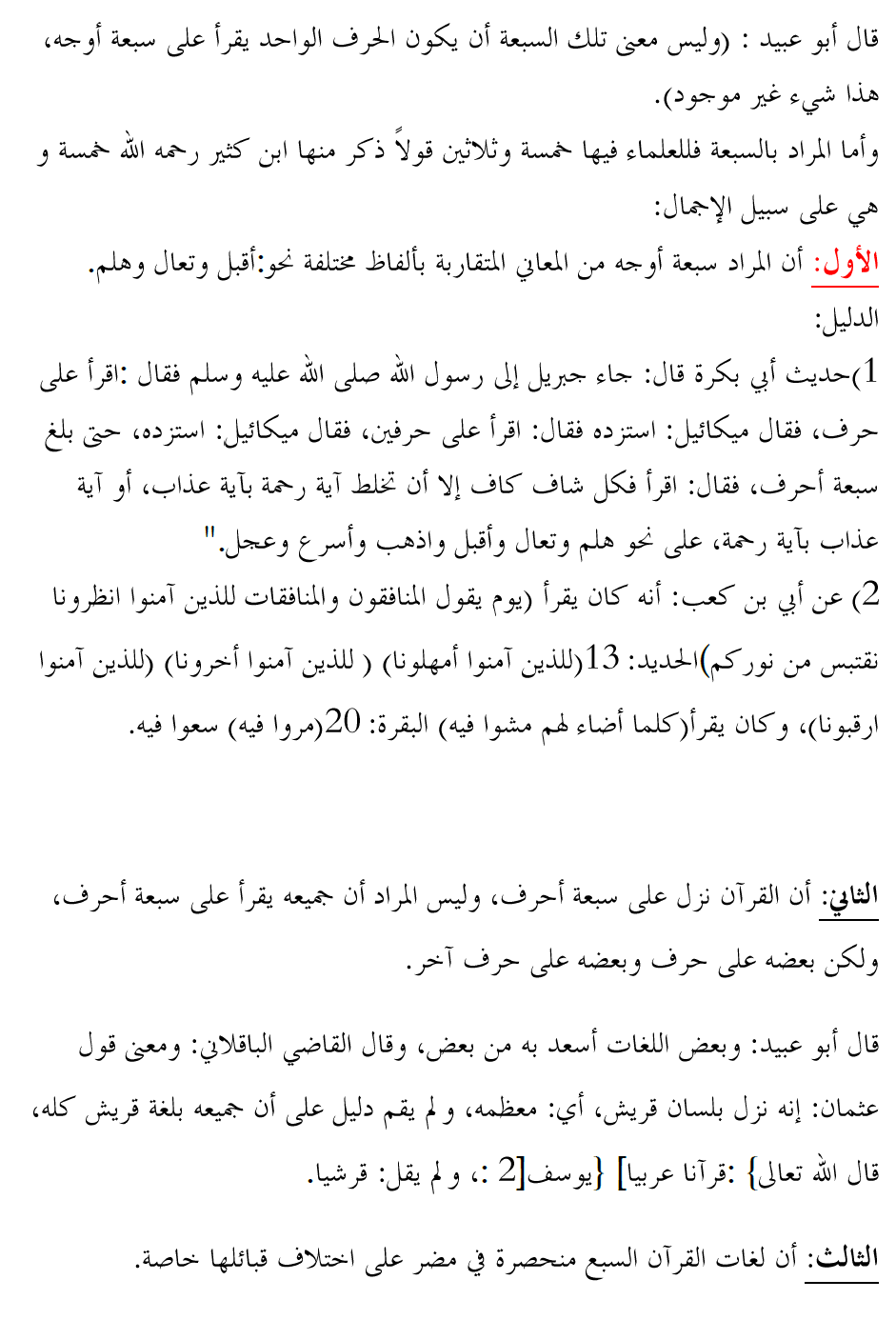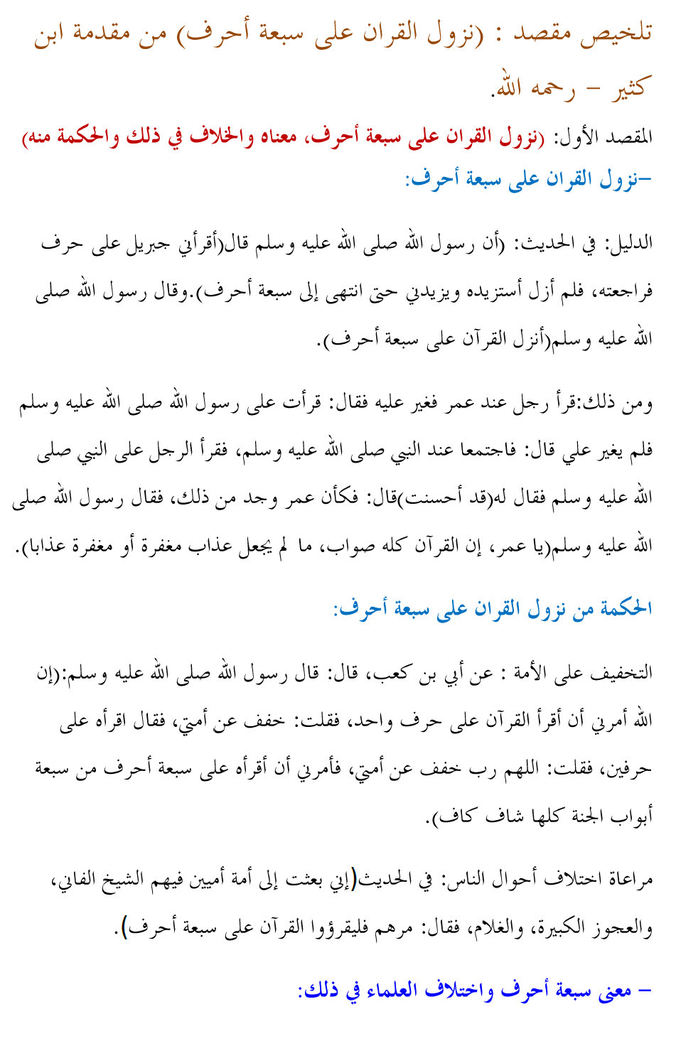 تلخيص مقصد : (نزول القران على سبعة أحرف) من مقدمة ابن كثير - رحمه الله. المقصد الأول: (نزول القران على سبعة أحرف، معناه والخلاف في ذلك والحكمة منه) -نزول القران على سبعة أحرف:الدليل: فيالحديث: (أنرسولاللهصلىاللهعليهوسلمقال(أقرأنيجبريلعلىحرففراجعته،فلمأزلأستزيدهويزيدنيحتىانتهىإلىسبعةأحرف).وقالرسولاللهصلىاللهعليهوسلم(أنزلالقرآنعلىسبعةأحرف). ومن ذلك:قرأرجلعندعمرفغيرعليهفقال: قرأتعلىرسولاللهصلىاللهعليهوسلمفلميغيرعليقال: فاجتمعاعندالنبيصلىاللهعليهوسلم،فقرأالرجلعلىالنبيصلىاللهعليهوسلمفقالله(قدأحسنت)قال: فكأنعمروجدمنذلك،فقالرسولاللهصلىاللهعليهوسلم(ياعمر،إنالقرآنكلهصواب،مالميجعلعذابمغفرةأومغفرةعذابا). الحكمة من نزول القران على سبعة أحرف: التخفيف على الأمة : عنأبيبنكعب،قال: قالرسولاللهصلىاللهعليهوسلم:(إناللهأمرنيأنأقرأالقرآنعلىحرفواحد،فقلت: خففعنأمتي،فقالاقرأهعلىحرفين،فقلت: اللهمربخففعنأمتي،فأمرنيأنأقرأهعلىسبعةأحرفمنسبعةأبوابالجنةكلهاشافكاف). مراعاة اختلاف أحوال الناس: فيالحديث)إنيبعثتإلىأمةأميينفيهمالشيخالفاني،والعجوزالكبيرة،والغلام،فقال: مرهمفليقرؤواالقرآنعلىسبعةأحرف(. - معنى سبعة أحرفواختلافالعلماءفيذلك: قال أبو عبيد : (وليس معنى تلك السبعة أن يكون الحرف الواحد يقرأ على سبعة أوجه، هذا شيء غير موجود). وأما المراد بالسبعة فللعلماء فيها خمسة وثلاثين قولاً ذكر منها ابن كثير رحمه الله خمسة و هي على سبيل الإجمال: الأول:أن المراد سبعة أوجه من المعاني المتقاربة بألفاظ مختلفة نحو:أقبل وتعالوهلم. الدليل: 1)حديث أبي بكرة قال: جاء جبريل إلى رسول الله صلى الله عليه وسلم فقال: اقرأ على حرف، فقال ميكائيل: استزده فقال: اقرأ على حرفين، فقالميكائيل: استزده، حتى بلغ سبعة أحرف، فقال: اقرأ فكل شاف كاف إلا أن تخلط آية رحمةبآية عذاب، أو آية عذاب بآية رحمة، على نحو هلم وتعال وأقبل واذهب وأسرعوعجل". 2) عن أبي بن كعب: أنه كان يقرأ (يوم يقول المنافقون والمنافقاتللذين آمنوا انظرونا نقتبس من نوركم(الحديد: 13(للذين آمنوا أمهلونا) (للذين آمنواأخرونا) (للذين آمنوا ارقبونا)، وكان يقرأ(كلما أضاءلهم مشوا فيه) البقرة: 20(مروا فيه) سعوا فيه.الثاني:أنالقرآننزلعلىسبعةأحرف،وليسالمرادأنجميعهيقرأعلىسبعةأحرف،ولكنبعضهعلىحرفوبعضهعلىحرفآخر. قال أبو عبيد: وبعض اللغات أسعد به من بعض، وقال القاضي الباقلاني: ومعنى قولعثمان: إنه نزل بلسان قريش، أي: معظمه، ولم يقم دليل على أن جميعه بلغة قريش كله،قال الله تعالى: {قرآنا عربيا} [يوسف: 2]، ولم يقل: قرشيا. الثالث: أن لغات القرآن السبع منحصرة في مضر على اختلاف قبائلها خاصة. الدليل: قول عثمان رضي الله عنه: إنالقرآن نزل بلغة قريش، وقريش هم بنو النضر بن الحارث على الصحيح من أقوال أهلالنسب، كما نطق به الحديث في سنن ابن ماجه وغيره. الرابع:أن وجوه القراءات ترجع إلى سبعة أشياء: - ما تتغير حركته ولا تتغير صورته ولامعناه مثل)ويضيقُ صدري)و"يضيقَ"، - ما لا تتغير صورته ويختلف معناه مثل(فقالواربنا باعِد بين أسفارنا)و "باعَد بين أسفارنا" - الاختلاف في الصورة والمعنى بالحرف مثل: (ننشزها)و"ننشرها" - الاختلاف بالكلمة مع بقاء المعنى مثل(كالعهن المنفوش) أو "كالصوفالمنفوش" - اختلاف الكلمة واختلاف المعنى مثل(وطلحمنضود) وطلع منضود. - بالتقدم والتأخر مثل)جاءت سكرةالموت بالحق(أو "سكرة الحق بالموت"، - أوبالزيادة مثل "تسع وتسعون نعجة أنثى"، "وأما الغلام فكان كافرا وكان أبواه مؤمنين". "فإن الله من بعد إكراههن لهن غفور رحيم" الخامس: أن المراد بالأحرف السبعة معاني القرآن وهي: أمر، ونهي، ووعد، ووعيد، وقصص،ومجادلة، وأمثال. قال ابن عطية: (وهذا ضعيف) والدليل: - لأن هذه لا تسمى حروفا. - الإجماع على أن التوسعة لم تقع في تحليل حلال ولا في تغيير شيء من المعاني. -هل الأحرف السبعة هي القراءات السبعة ؟ قالالقرطبي: (قالكثيرمنعلمائناكالداوديوابنأبيصفرةوغيرهما: هذهالقراءاتالسبعالتيتنسبله