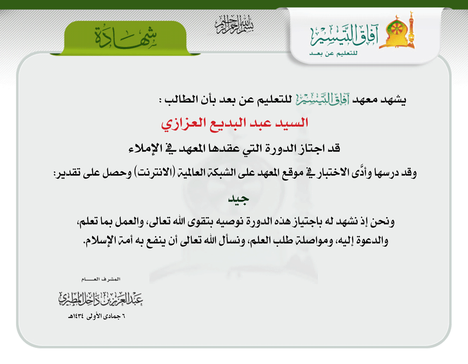 العودة   معهد آفاق التيسير للتعليم عن بعد > برنامج الإعداد العلمي العام > خطة التأسيس العلمي > السجلات الدراسية