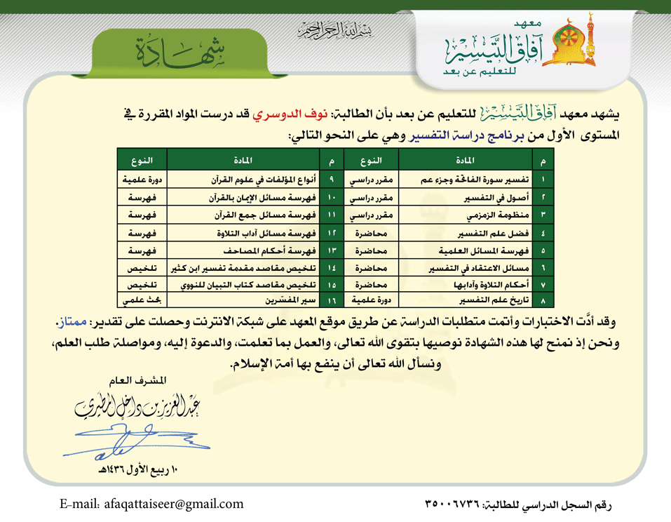 العودة   معهد آفاق التيسير للتعليم عن بعد > برنامج إعداد المفسر > خطة التأسيس في التفسير > السجلات الدراسية