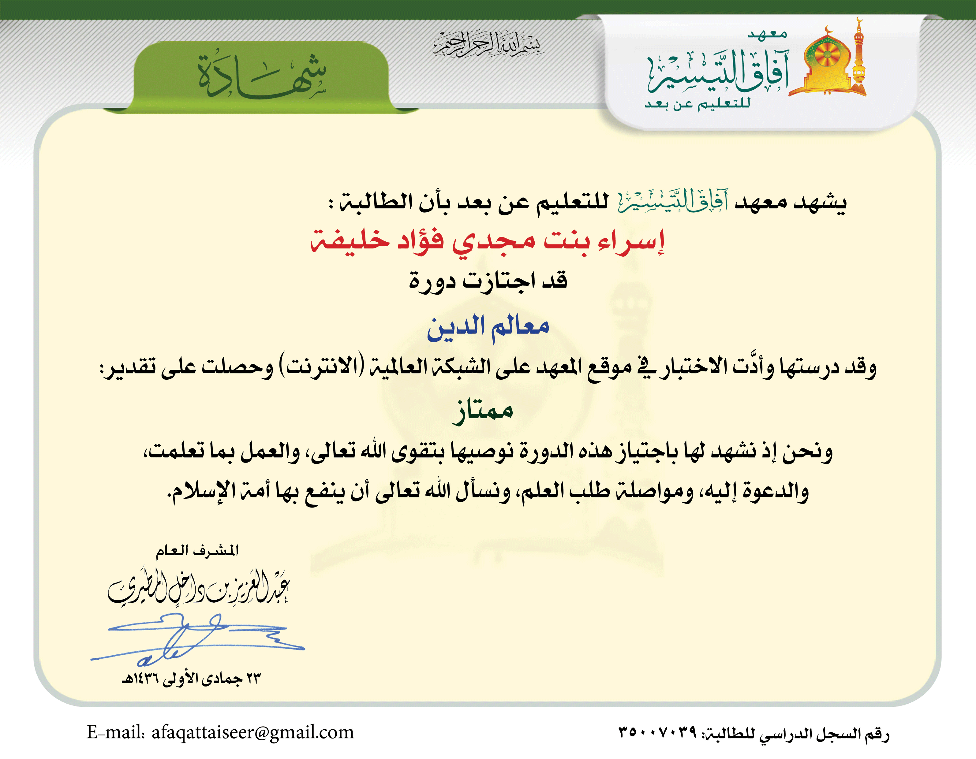 شهادة اجتياز المستوى الأول من برنامج إعداد المفسر: (هنا)