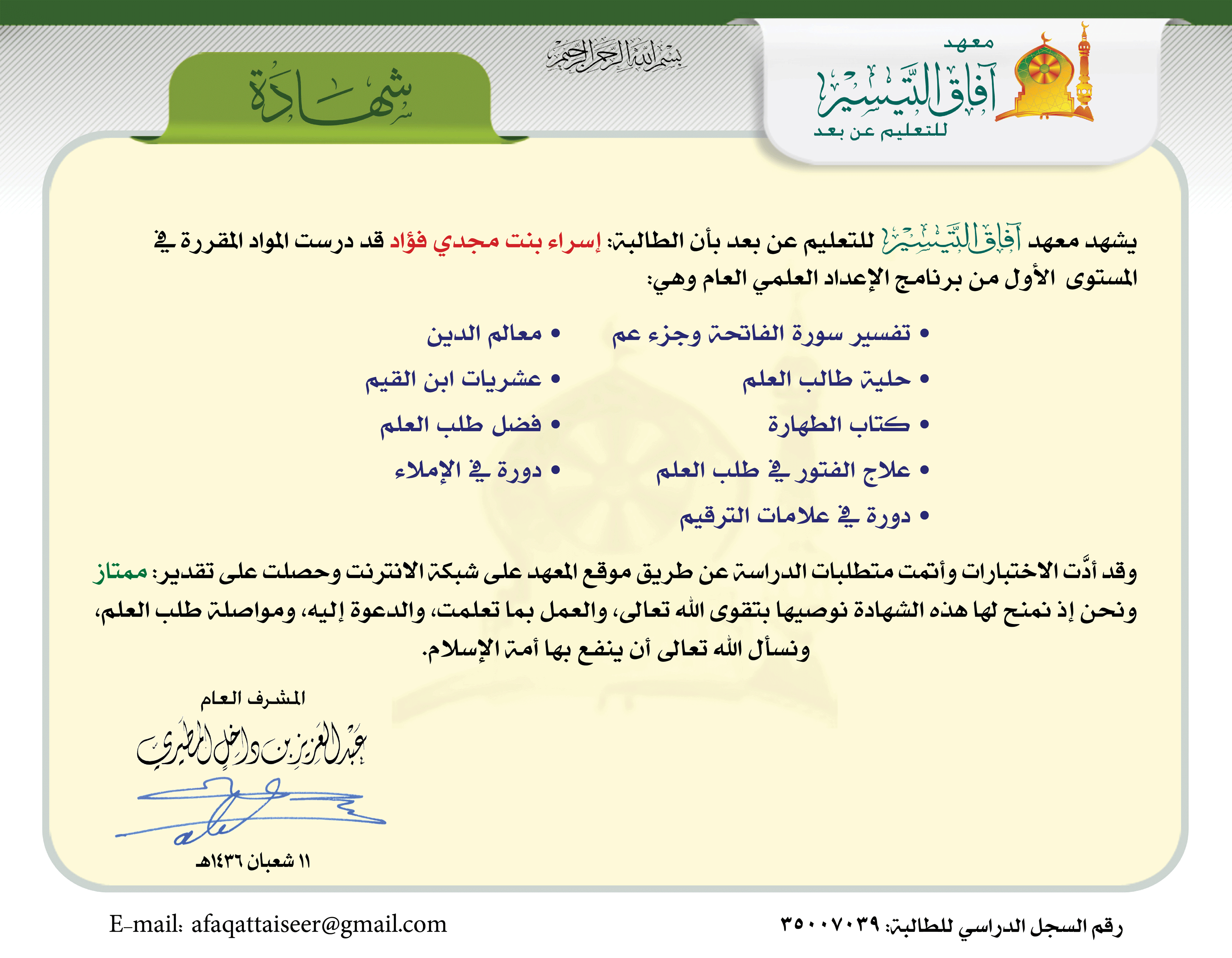 العودة   معهد آفاق التيسير للتعليم عن بعد > برنامج الإعداد العلمي العام > خطة التأسيس العلمي > السجلات الدراسية