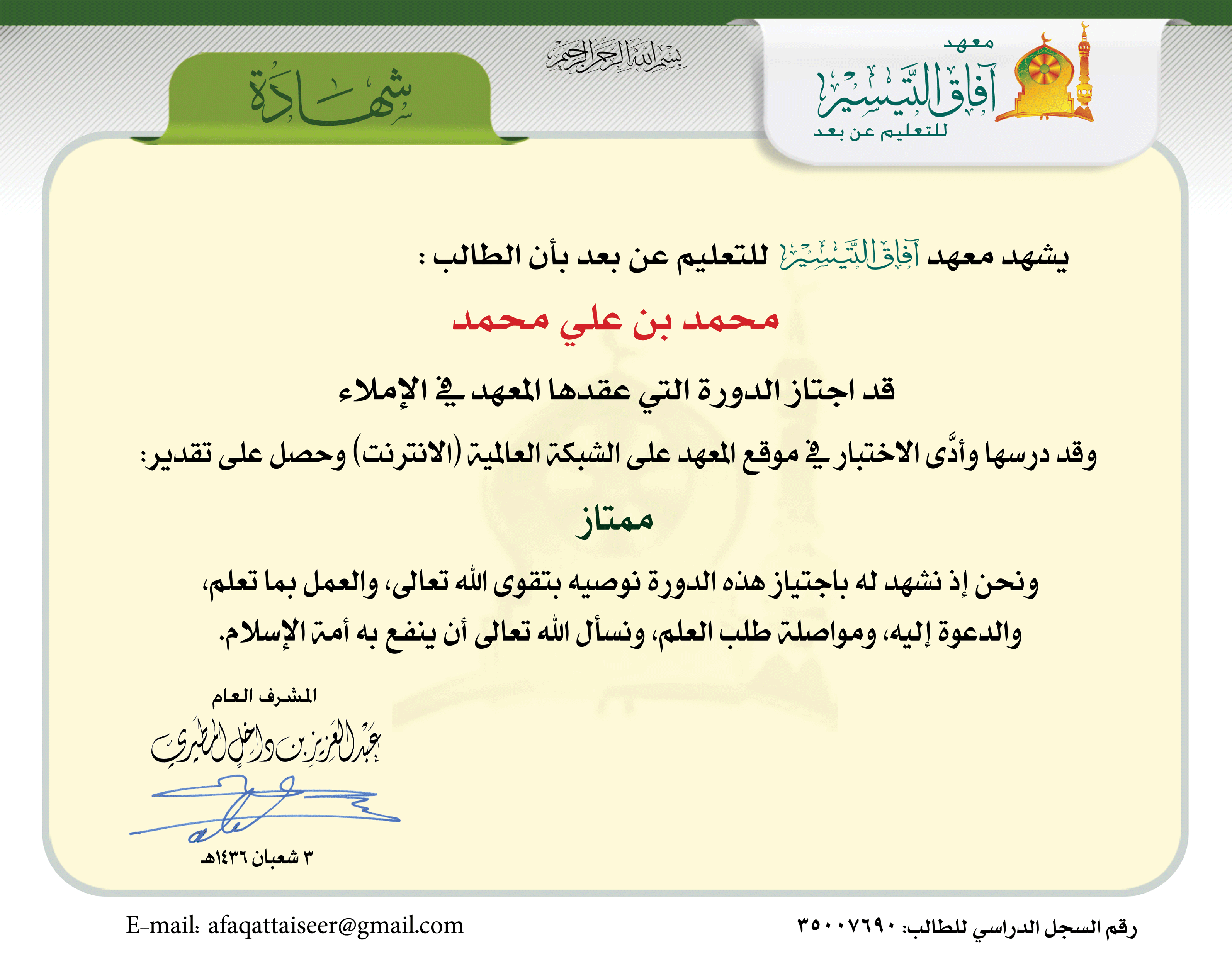 تــاريـخ الـتـخـرج: 15 ذو الحجة 1435 ه