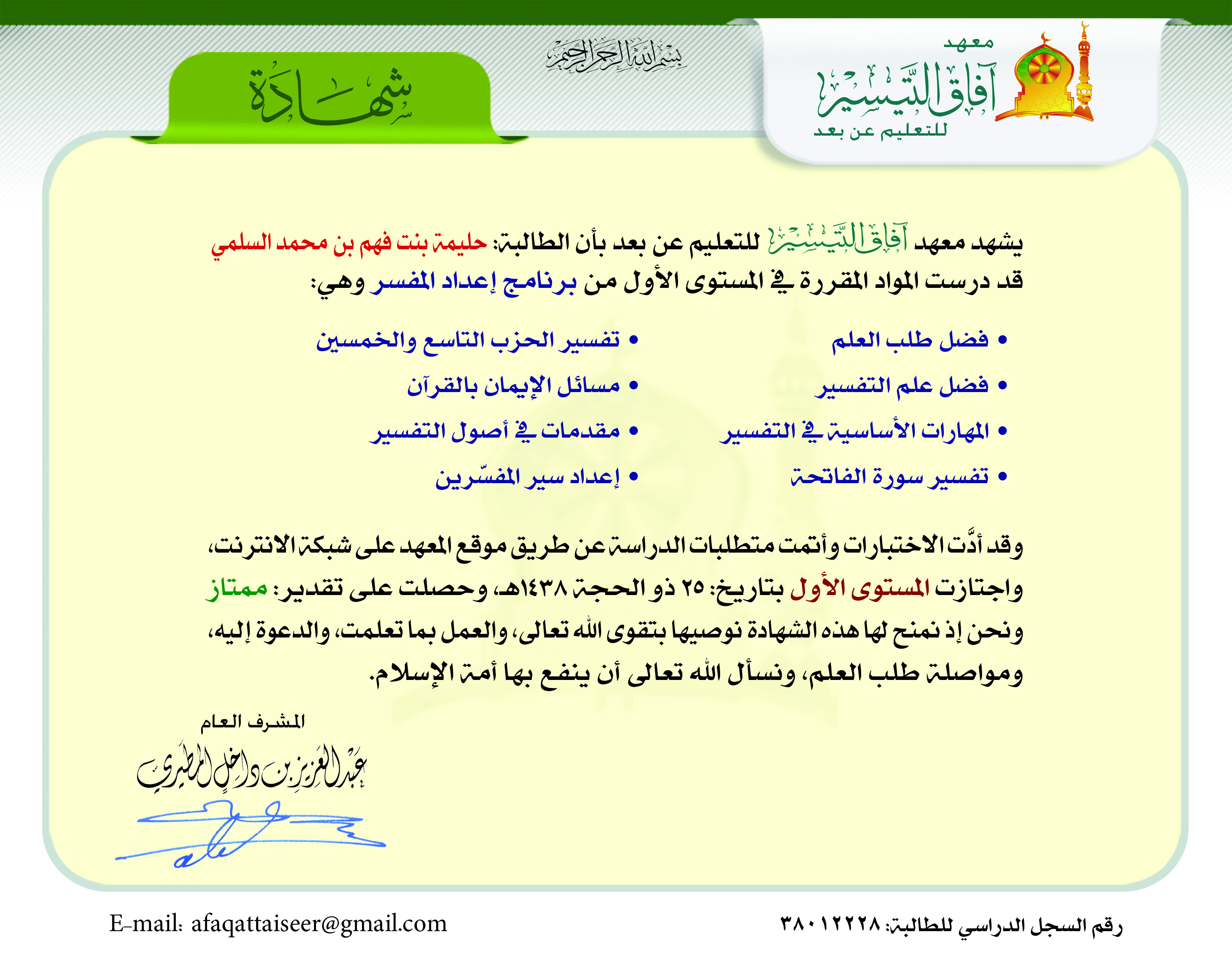 العودة   معهد آفاق التيسير للتعليم عن بعد > برنامج إعداد المفسر > إدارة برنامج إعداد المفسر > إدارة برنامج إعداد المفسر