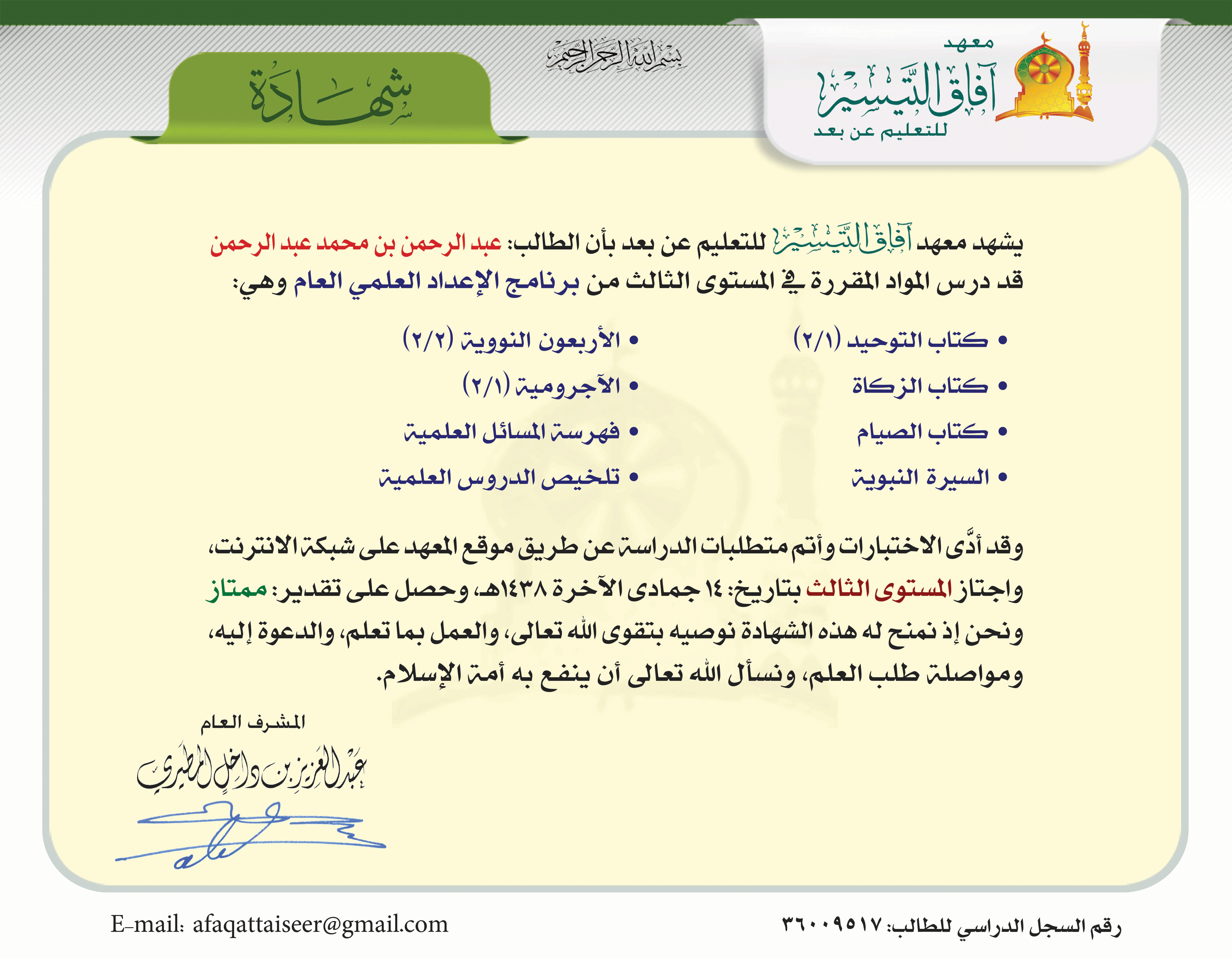 العودة   معهد آفاق التيسير للتعليم عن بعد > برنامج الإعداد العلمي العام > خطة التأسيس العلمي > السجلات الدراسية