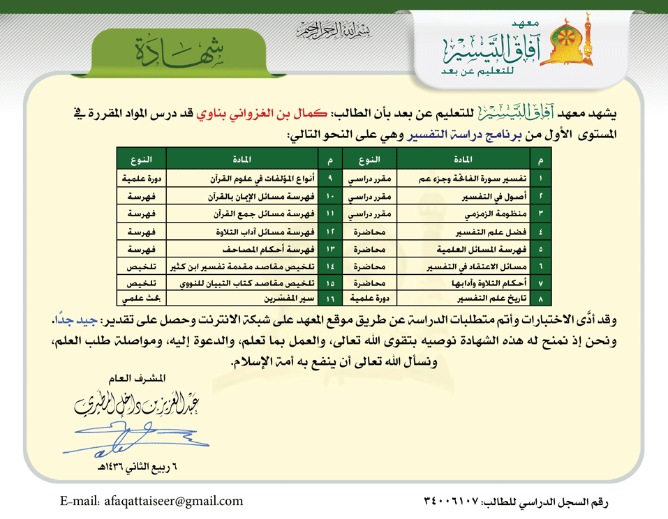 العودة   معهد آفاق التيسير للتعليم عن بعد > برنامج الإعداد العلمي العام > خطة التأسيس العلمي > السجلات الدراسية