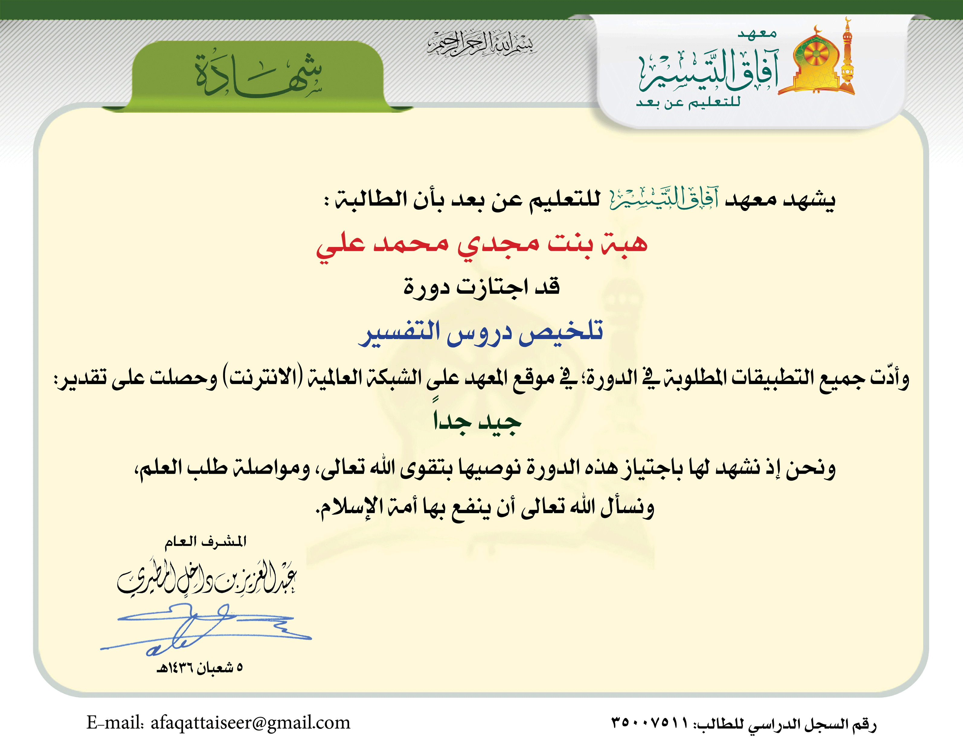 - تاريخ التخرج: 14 جمادى الأولى 1436 ه