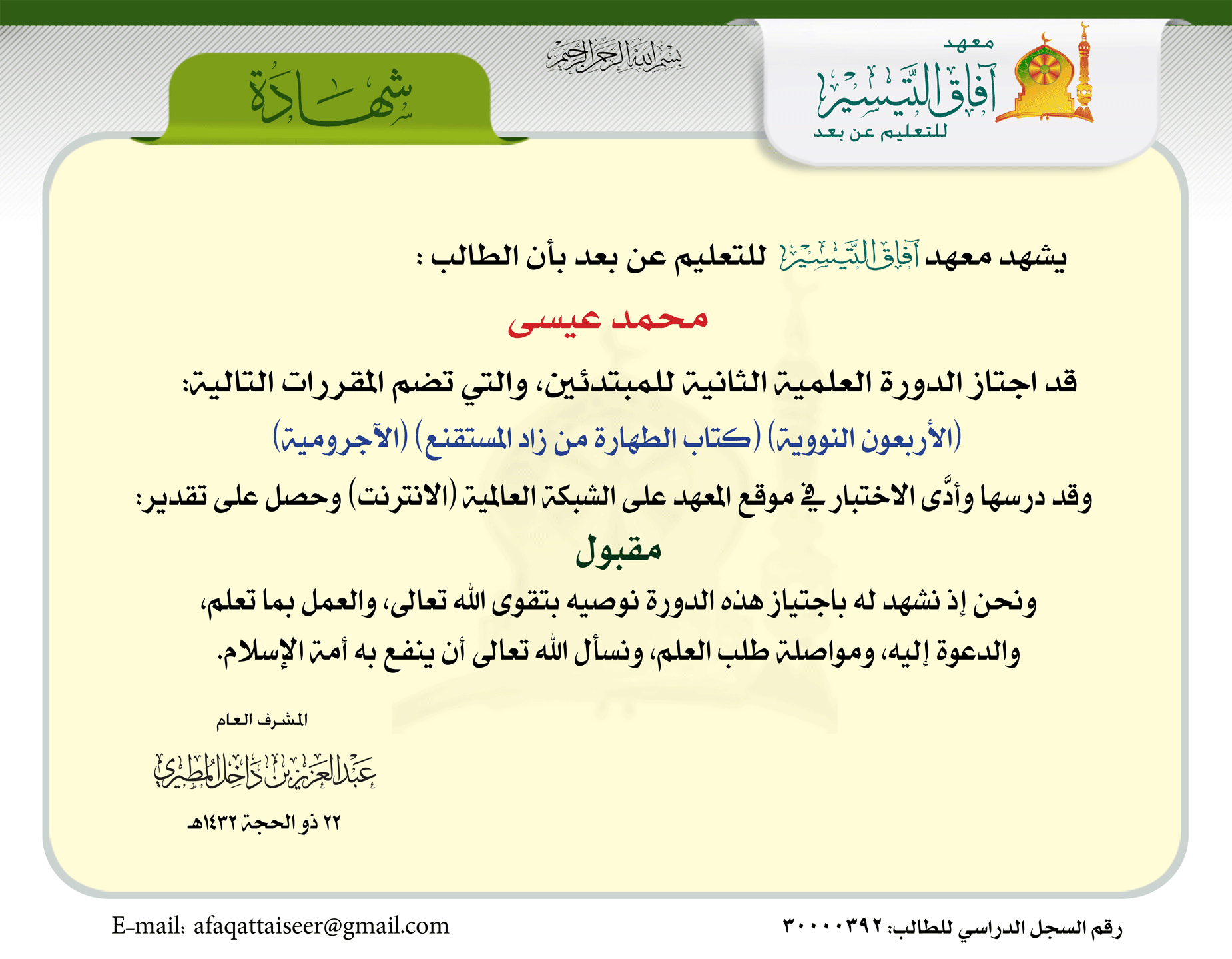 رقم السجل الدراسي: 30000392
