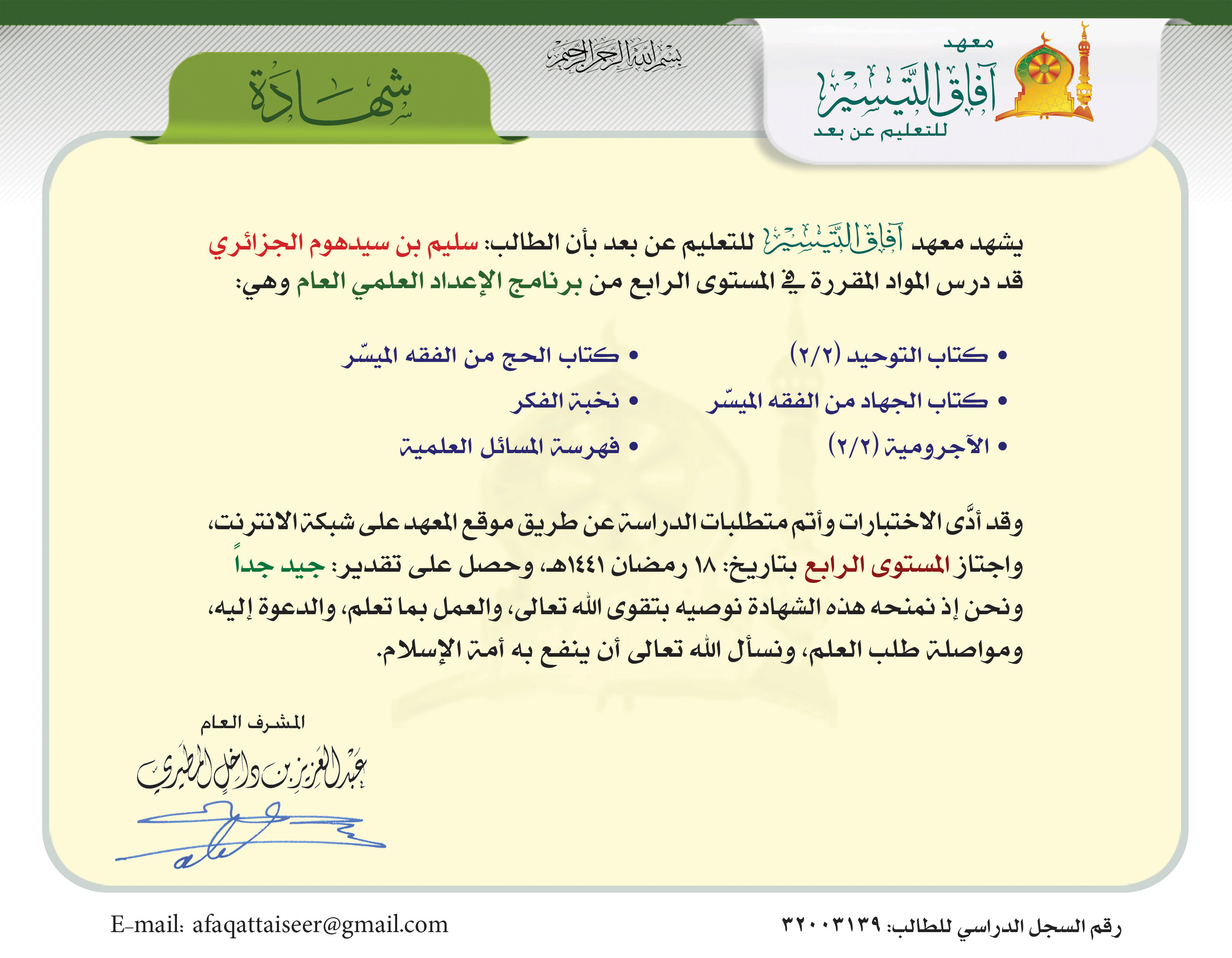 - تاريخ التخرج: 27 رمضان 1441 هـ