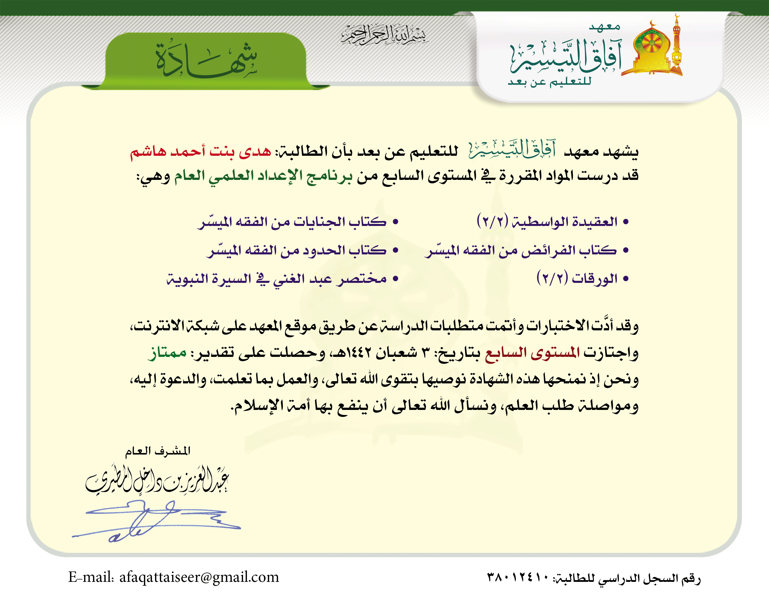 سجل الطالبة: هدى أحمد هاشم