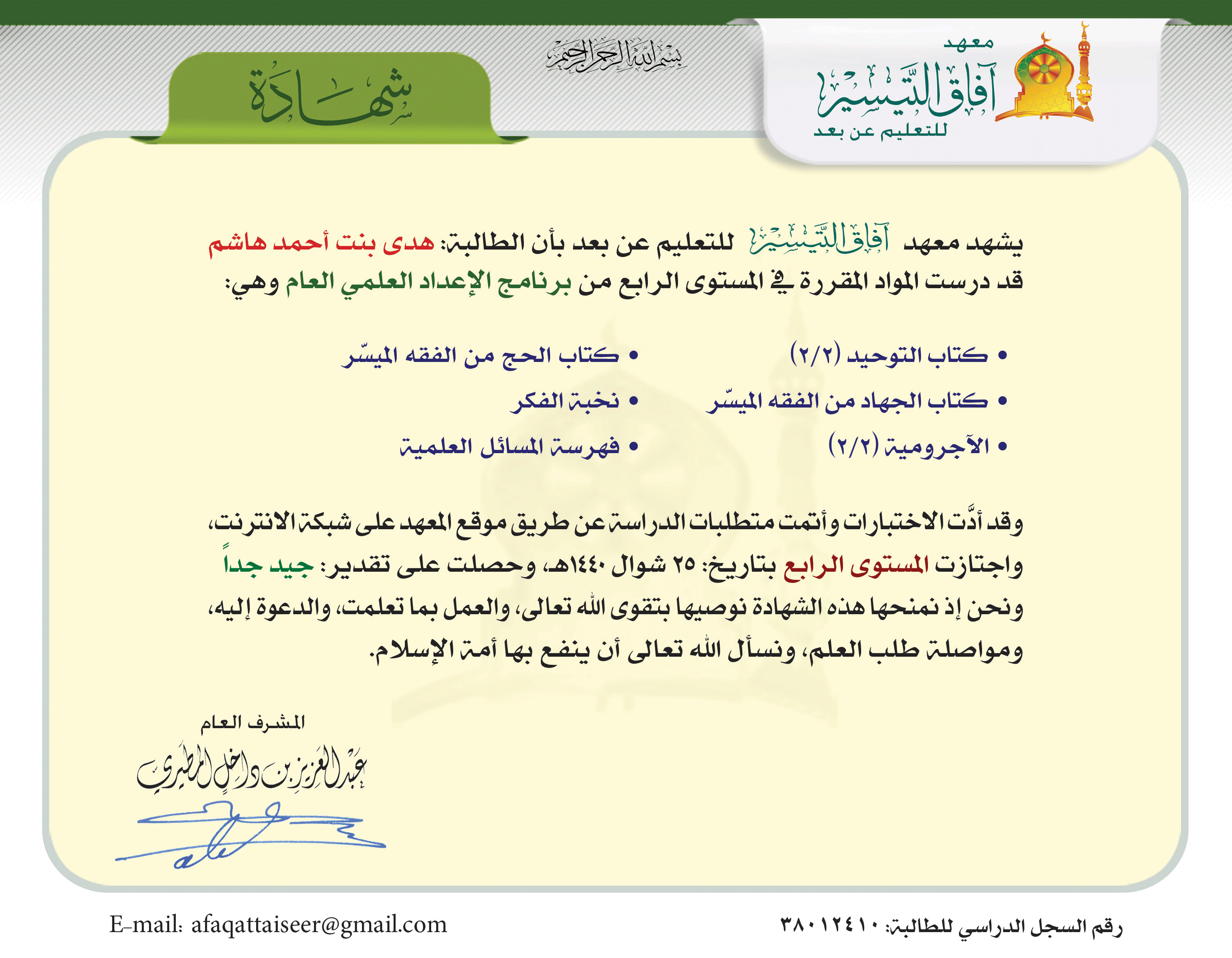 - تاريخ التخرج: 25 شوال 1440 هـ