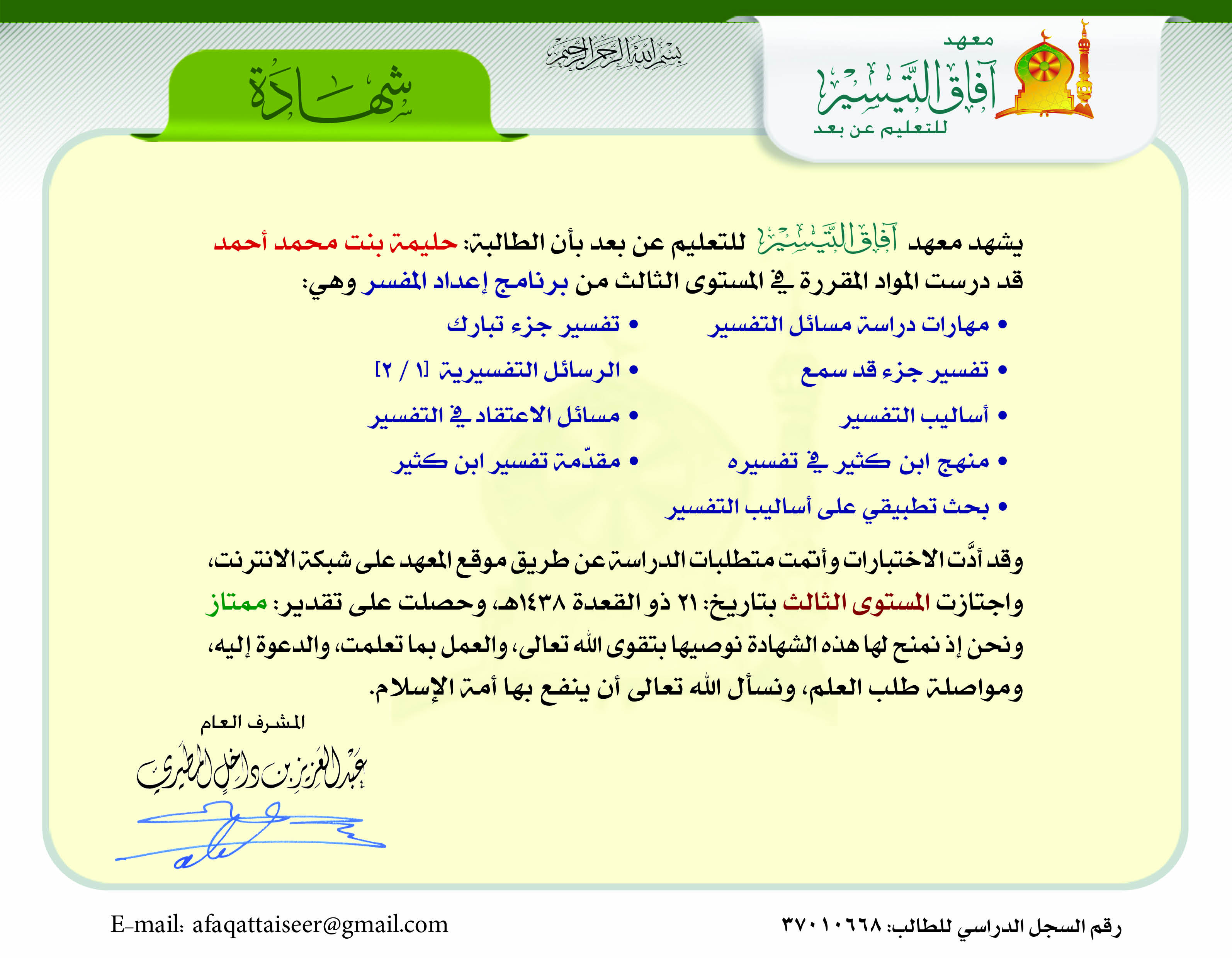 العودة   معهد آفاق التيسير للتعليم عن بعد > برنامج إعداد المفسر > خطة التأسيس في التفسير > السجلات الدراسية