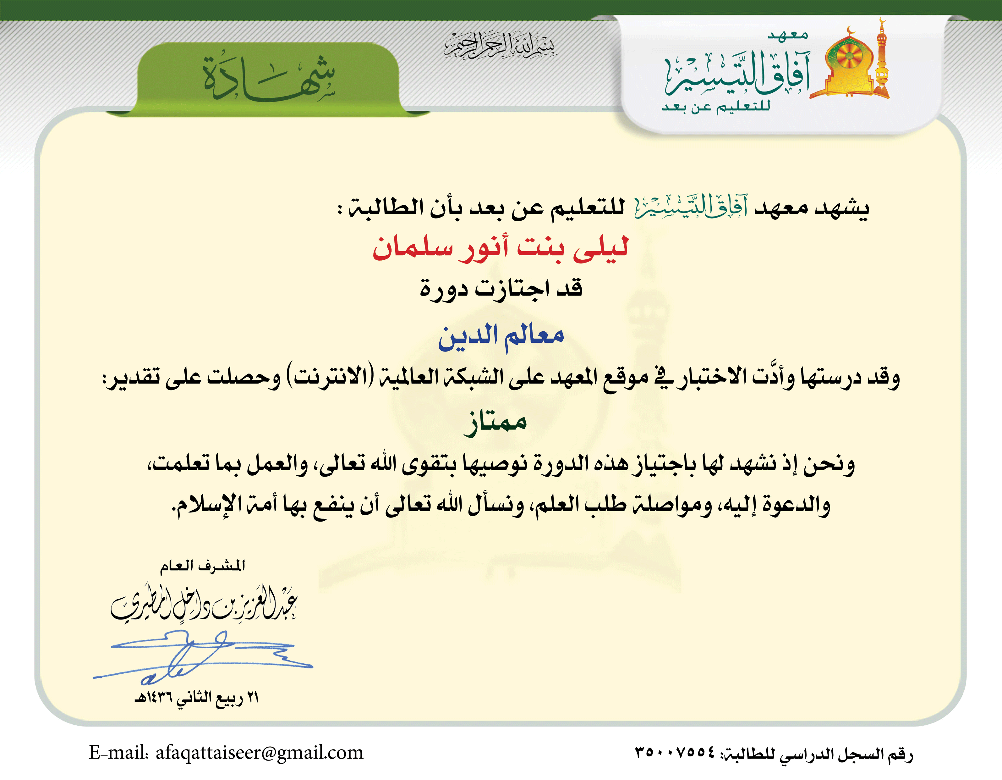 تــاريـخ الـتـخـرج: 21 ربيع ثاني 1436 هـ