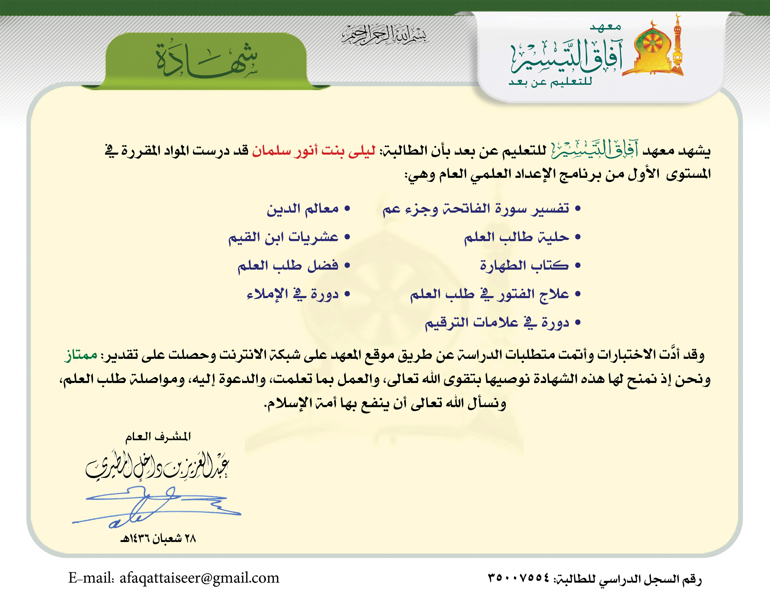 العودة   معهد آفاق التيسير للتعليم عن بعد > برنامج الإعداد العلمي العام > خطة التأسيس العلمي > السجلات الدراسية