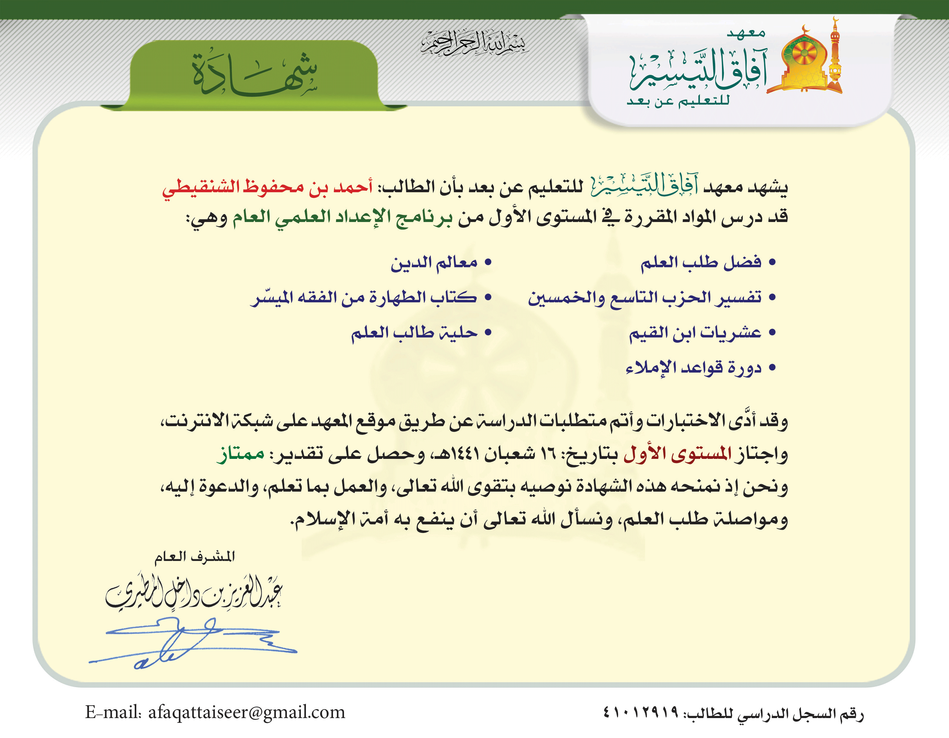 فيسرني أن أهنّئ الإخوة والأخوات الأفاضل الذين أبانوا عن جدّ واجتهاد وحسن انتظام في أداء المهام الدراسية على الخطط الأسبوعية في برنامج الإعداد العلمي العام حتى اجتازوا المستوى الأول بنجاح