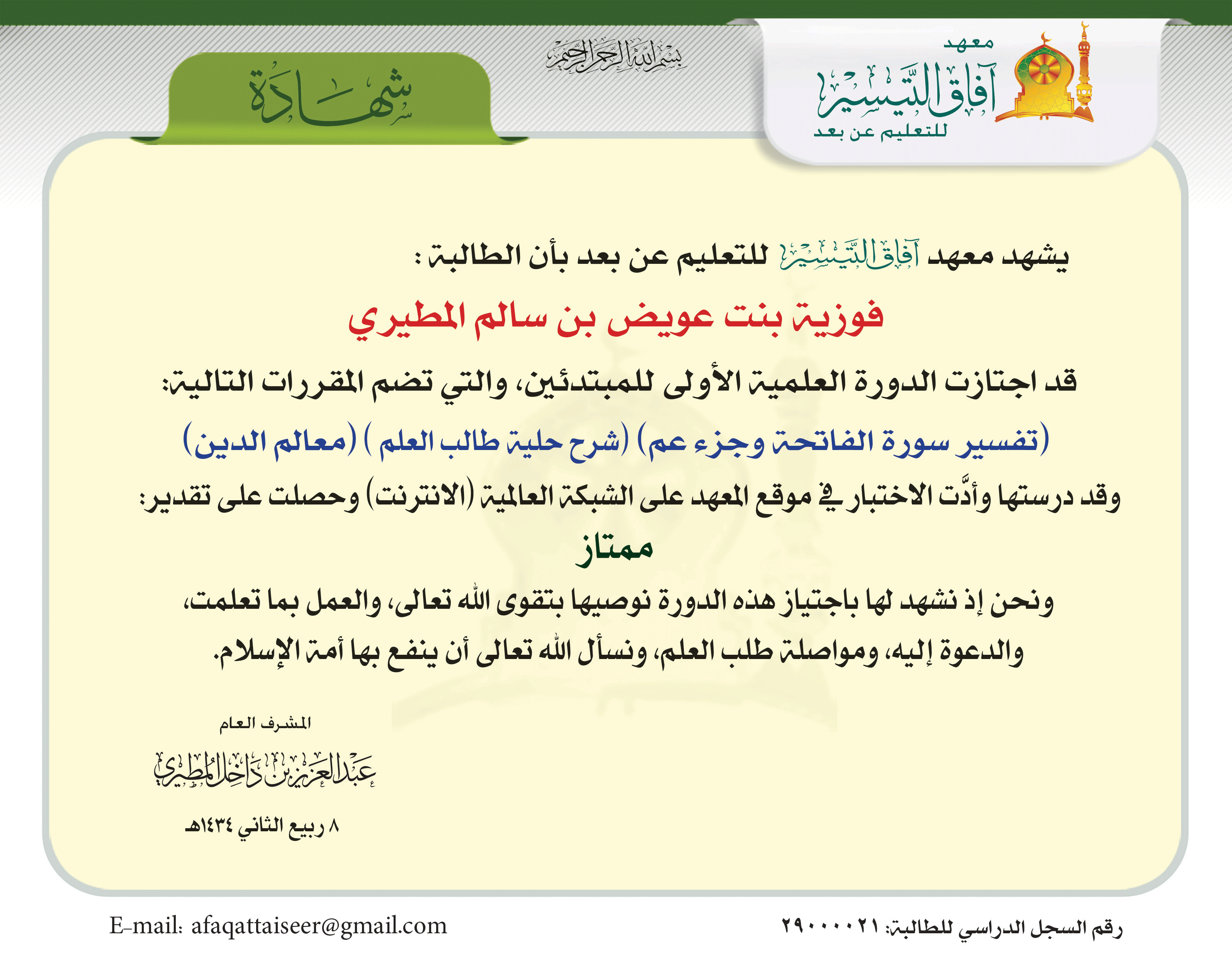 العودة   معهد آفاق التيسير للتعليم عن بعد > برنامج الإعداد العلمي العام > خطة التأسيس العلمي > السجلات الدراسية