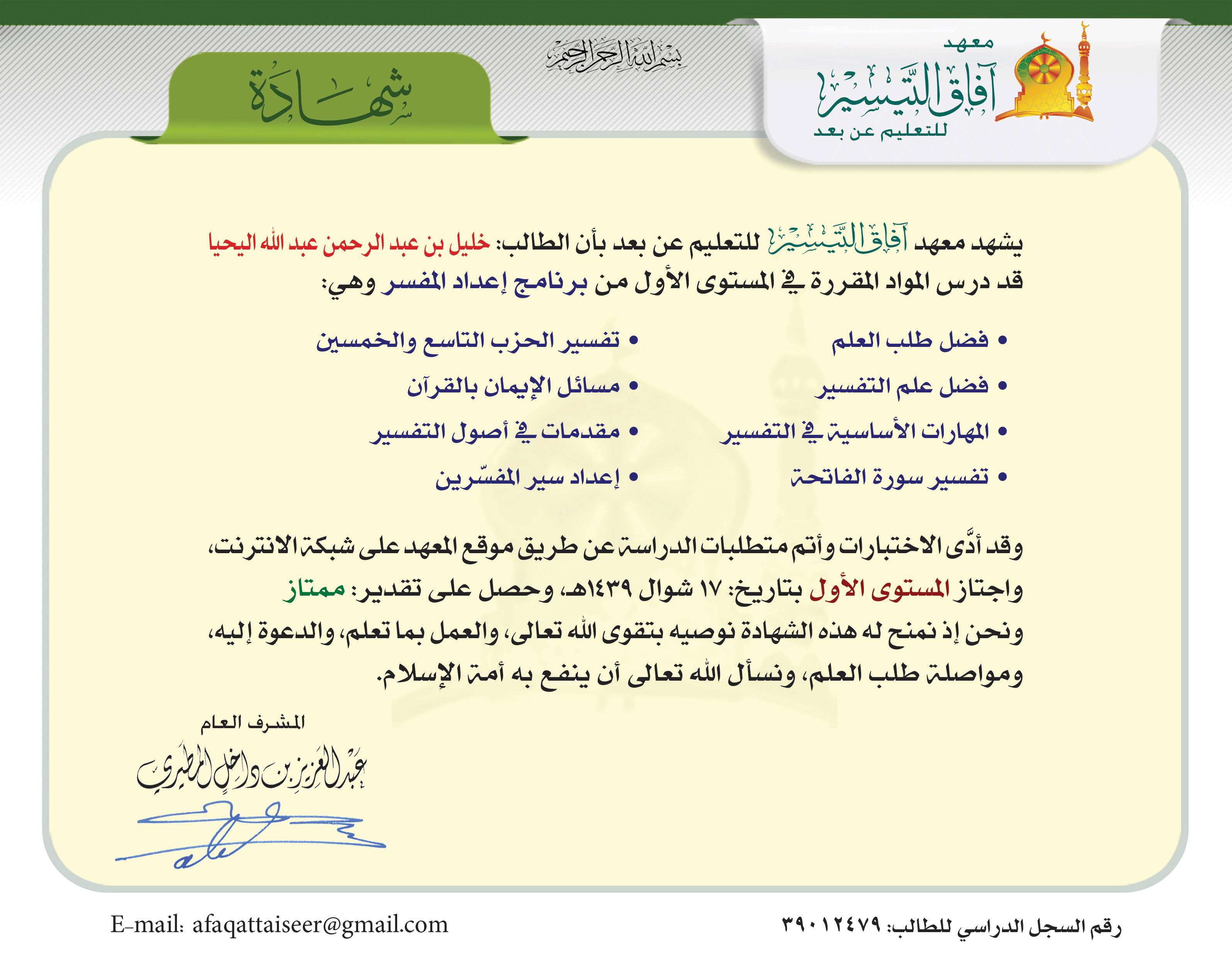العودة   معهد آفاق التيسير للتعليم عن بعد > برنامج إعداد المفسر > إدارة برنامج إعداد المفسر > إدارة برنامج إعداد المفسر