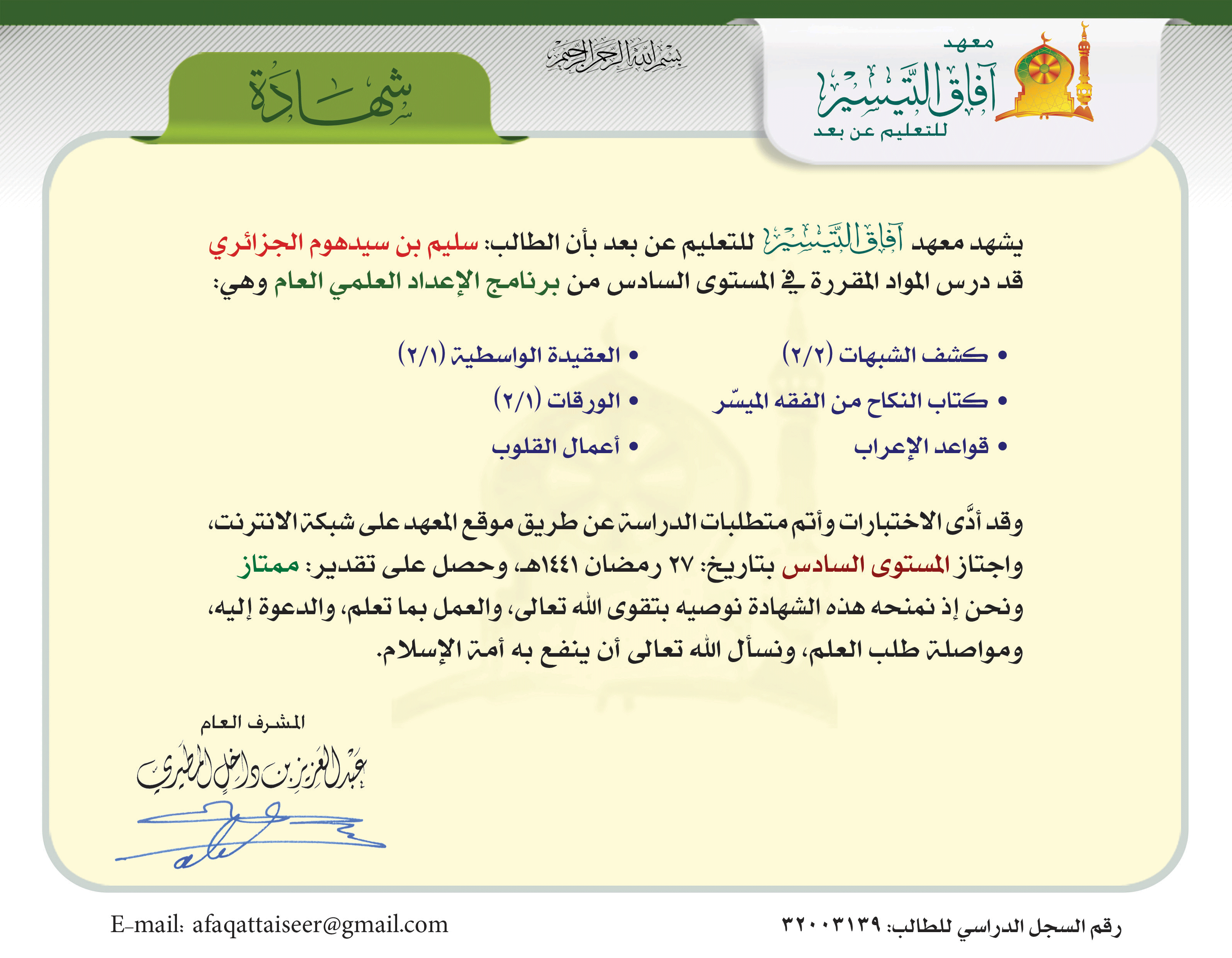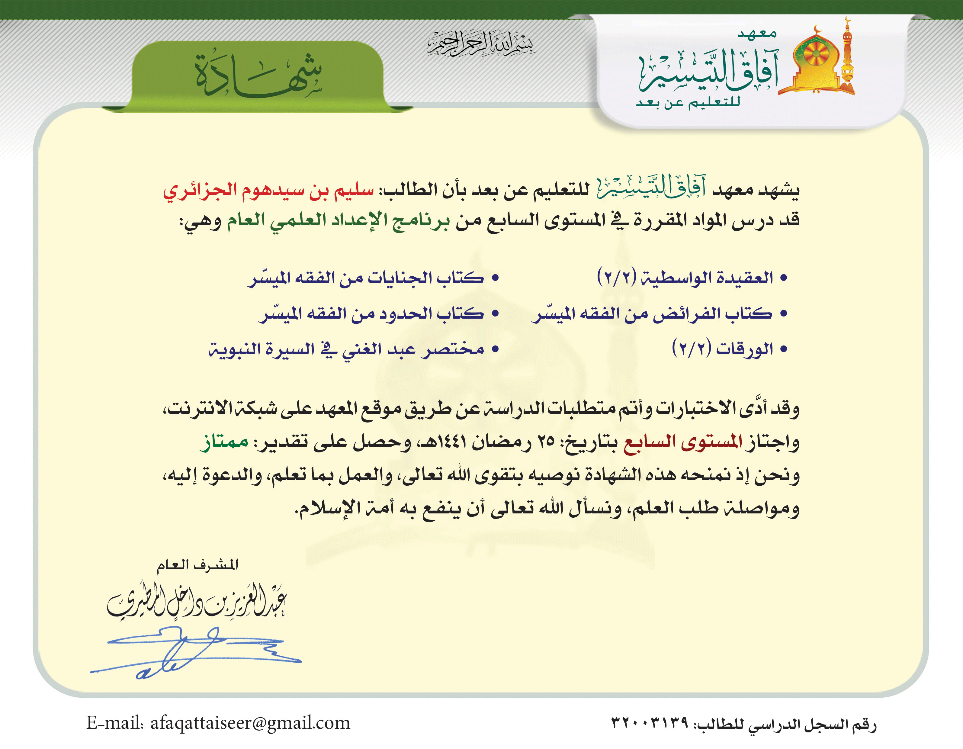 - تاريخ التخرج: 27 رمضان 1441 هـ