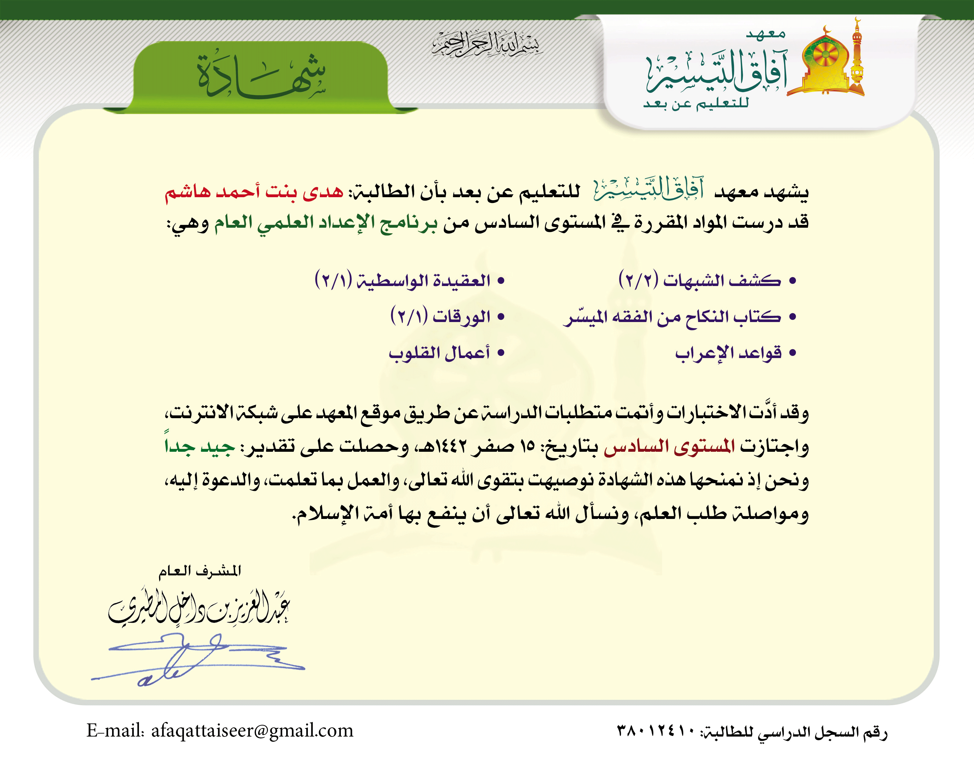 - تاريخ التخرج: 15 صفر 1442 هـ