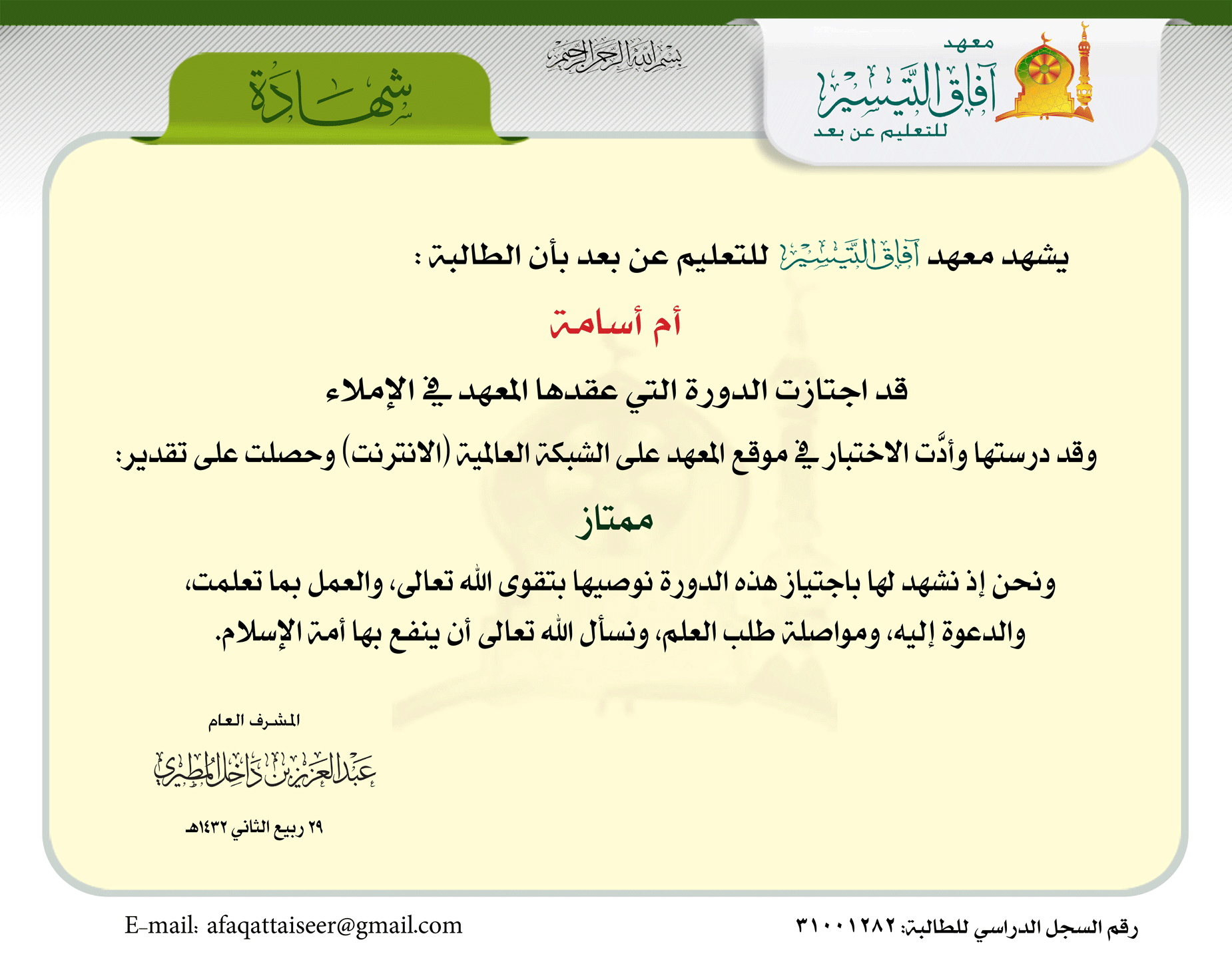 العودة   معهد آفاق التيسير للتعليم عن بعد > برنامج الإعداد العلمي العام > خطة التأسيس العلمي > السجلات الدراسية