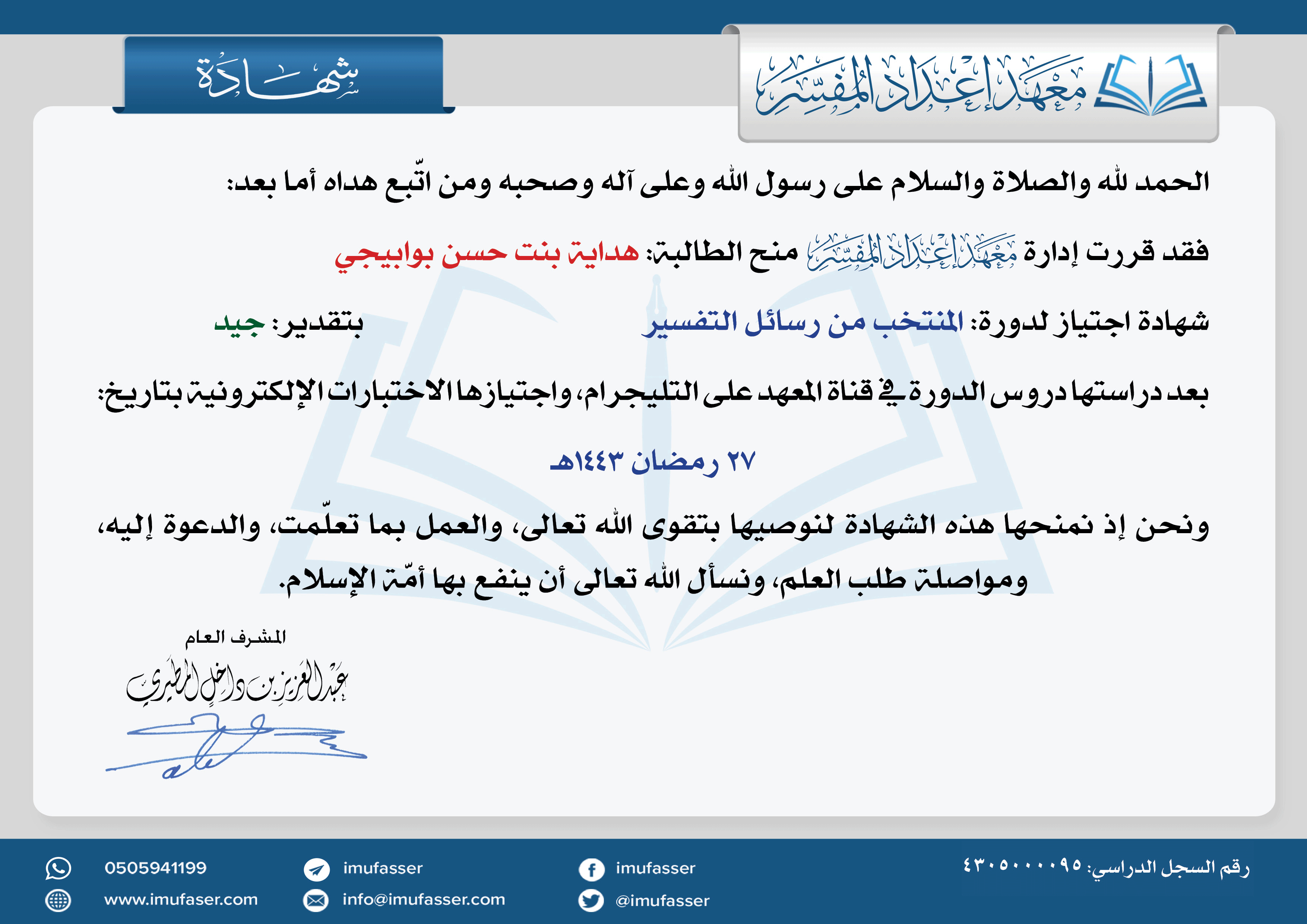 مستوى الطالبة: رقم السجل الدراسي: 4305000095 تاريخ التسجيل: رقم العضوية: دورة الرسائل التفسيرية: - المجموع الكلي: 76% - تاريخ التخرج: 27 رمضان 1443 هـ - التقدير: جيد - الشهادة: هنا