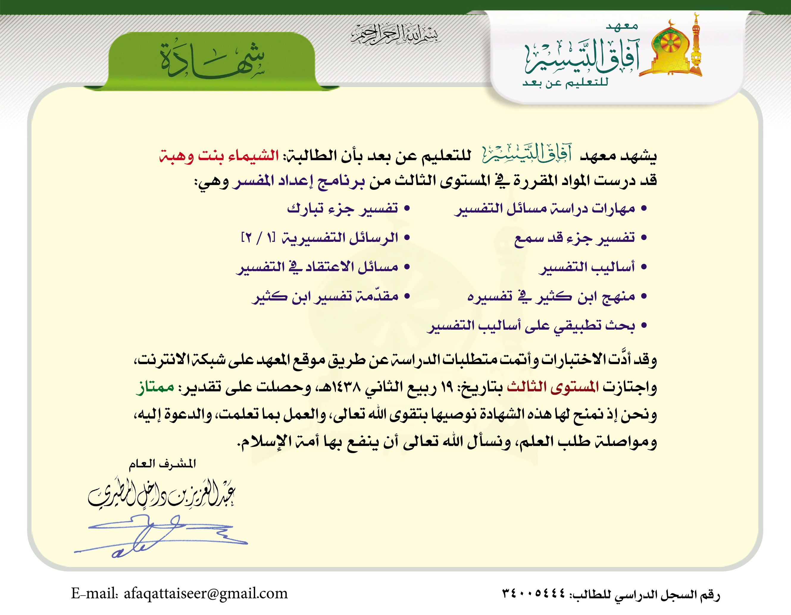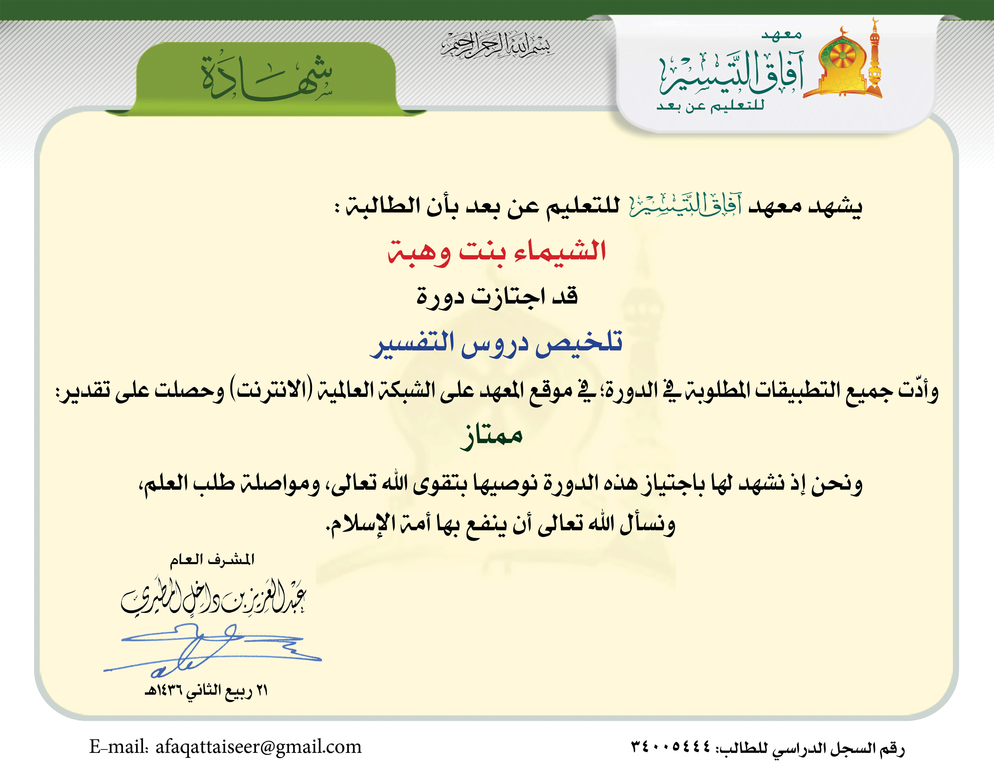 العودة   معهد آفاق التيسير للتعليم عن بعد > برنامج الإعداد العلمي العام > خطة التأسيس العلمي > السجلات الدراسية