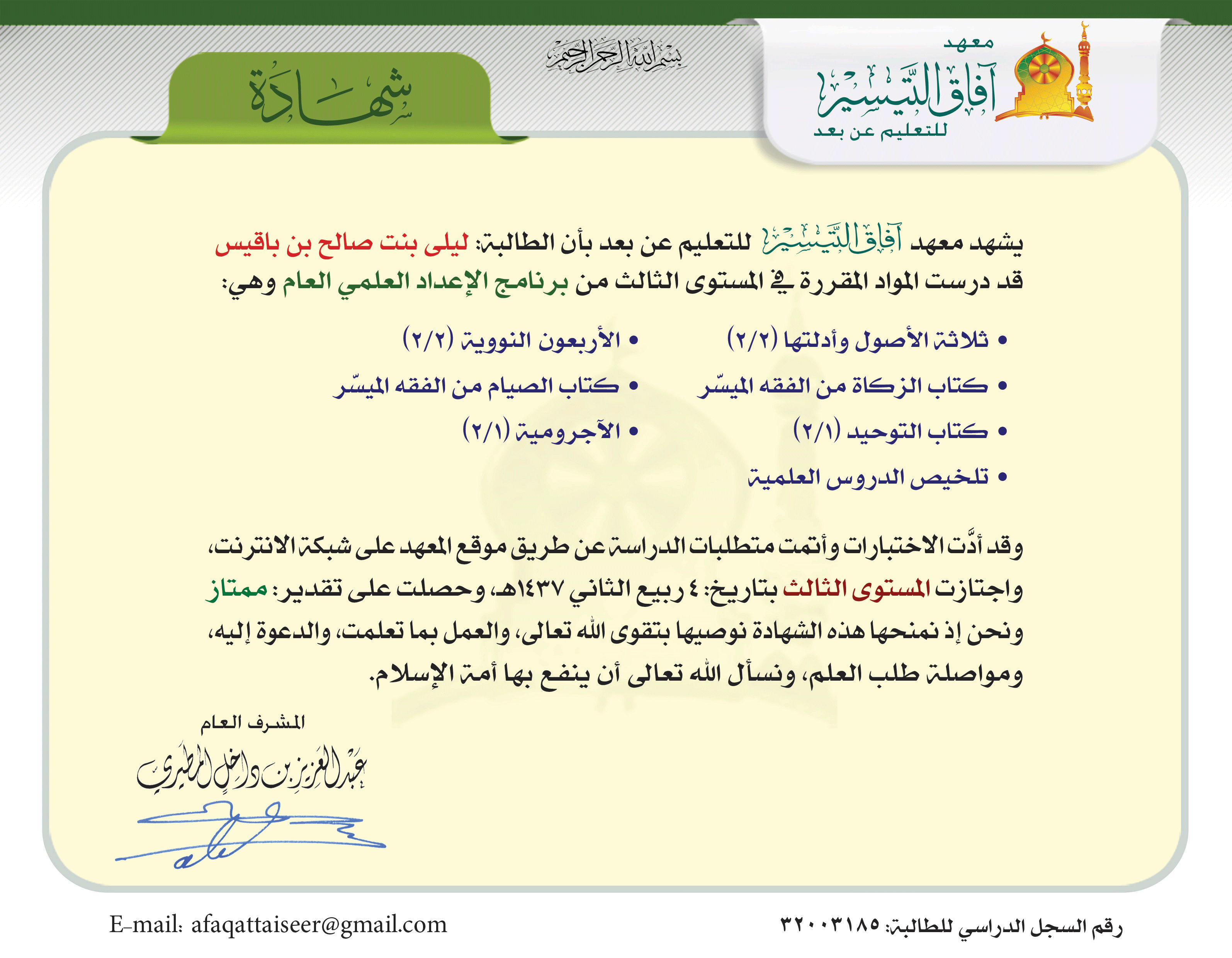 العودة   معهد آفاق التيسير للتعليم عن بعد > برنامج الإعداد العلمي العام > خطة التأسيس العلمي > السجلات الدراسية